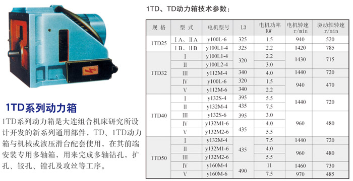 1TD系列动力箱安装在液压滑台及机械滑台等进给通用部件上,其前端面安装多轴箱,用来完成多轴钻孔、扩孔、铰孔、倒角、≠盘端面、镗孔及攻丝等工序。 1TD系列动力箱有两种型式。
